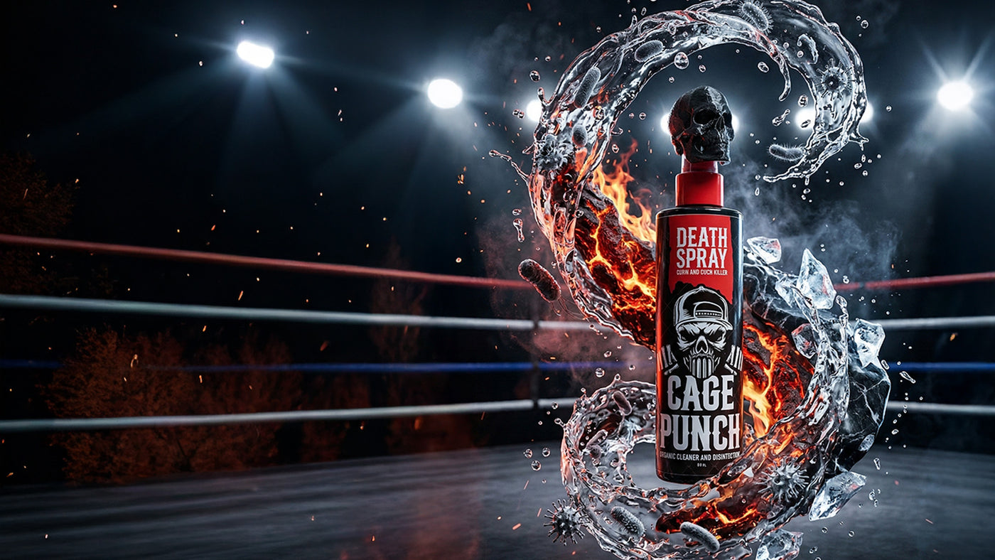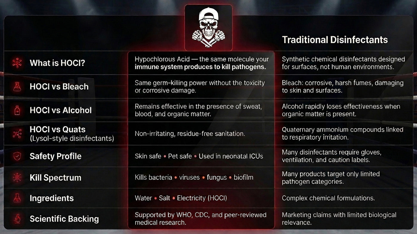 Death Spray is HOCl — the molecule your immune system already makes to fight infection. 120x more effective than bleach. Safe on skin, gear, mats, kids, and pets. Nothing left behind.